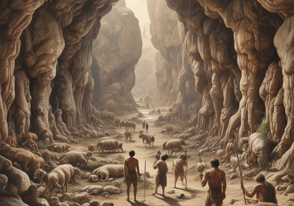 Le Paléolithique (“âge de la pierre ancienne”) ouvre la Préhistoire et dure une éternité à l’échelle humaine. On y voit une pluralité d’espèces au fil du temps (Homo habilis, Homo erectus/ergaster, Homo heidelbergensis, Néandertal), puis l’arrivée et la diffusion d’Homo sapiens qui finit par rester seul sur scène (nous, donc). Les groupes sont mobiles, l’économie est chasse-pêche-cueillette, l’outillage est en pierre taillée (du galet aménagé aux lames très fines), la maîtrise du feu structure la vie sociale (cuisine, chaleur, protection, veillées), et l’art est bien présent (peintures rupestres, parures, figurines, musique—oui, déjà). Ce monde est souple, opportuniste, incroyablement adaptatif.